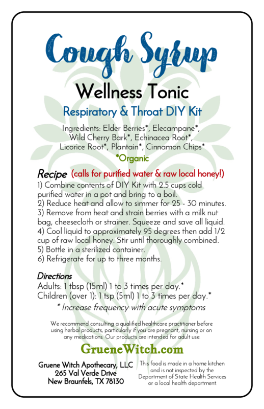 Ease your cough and soothe your throat with our delicious, organic Cough Syrup Respiratory & Throat Wellness Tonic DIY Kit. It is thoughtfully crafted with certified organic Elder berries, Wild Cherry (bark), Elecampane, Echinacea, Plantain, Raw Local Honey, Licorice (root) and Cinnamon.
