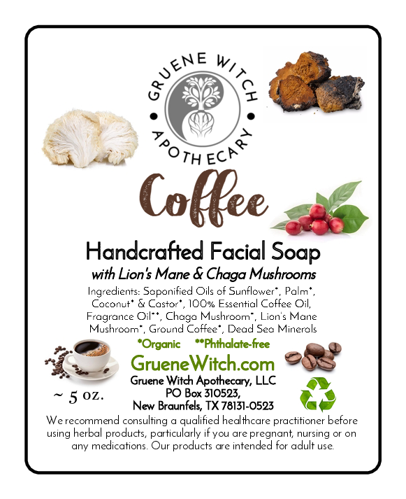 Ingredients: Saponified Oils of Sunflower*, Palm*, Coconut* & Castor*, 100% Essential Coffee Oil, Fragrance Oil**, Chaga Mushroom*, Lion’s Mane Mushroom*, Ground Coffee*, Dead Sea Minerals