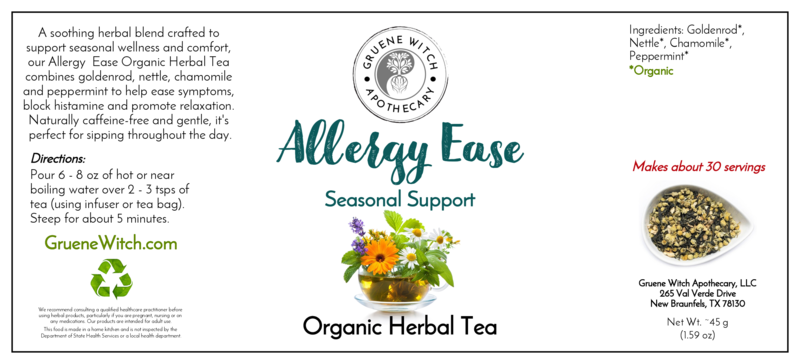 A soothing herbal blend crafted to support seasonal wellness and comfort, our Allergy Ease Organic Herbal Tea combines goldenrod, nettle, chamomile and peppermint to help ease symptoms, block histamine and promote relaxation. Naturally caffeine-free and gentle, it's perfect for sipping throughout the day.