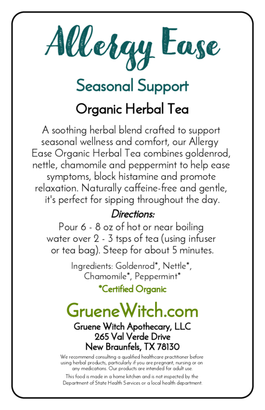 Ingredients: Goldenrod*, Nettle*, Chamomile*, Peppermint*