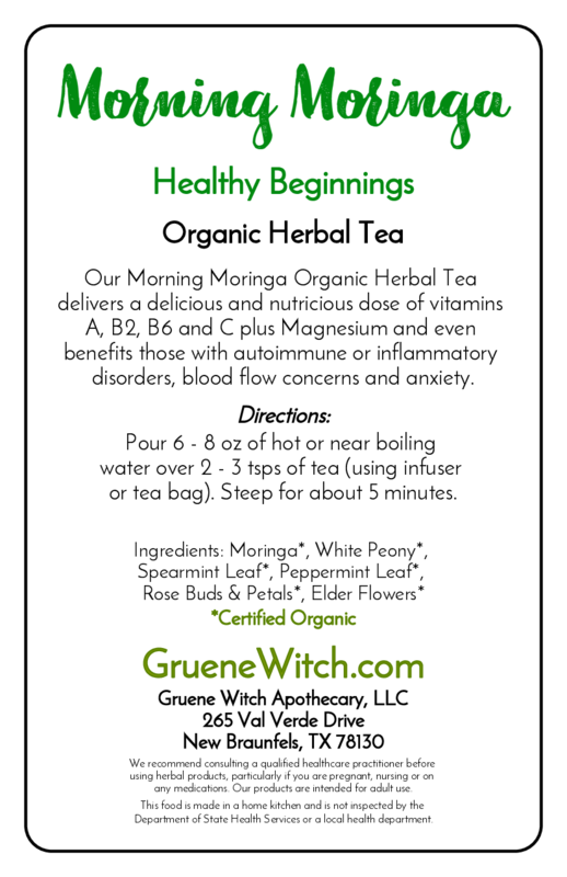 Our Morning Moringa Organic Herbal Tea delivers a delicious and nutricious dose of vitamins A, B2, B6 and C plus Magnesium and even benefits those with autoimmune or inflammatory disorders, blood flow concerns and anxiety.