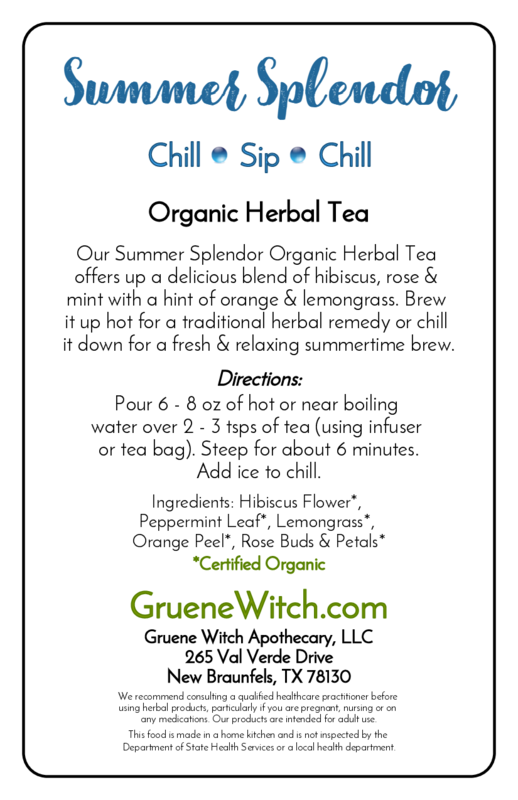 “Visited the Gruene Witch Apothecary stand at the New Braunfels Farmer's Market this weekend and purchased the Summer Splendor Organic Tea blend. Just got to make my first cup tonight and it is amazing! Very comforting, light and almost fruity (very slightly tart) with an absolutely beautiful and deep rose color. She recommended drinking it cold but fixed it as a hot tea tonight and simply love it, although I will be trying it over ice soon. I usually drink local honey with hot teas, but I didn't even want to add any to this blend. Will definitely be purchasing more!” ~ Liz